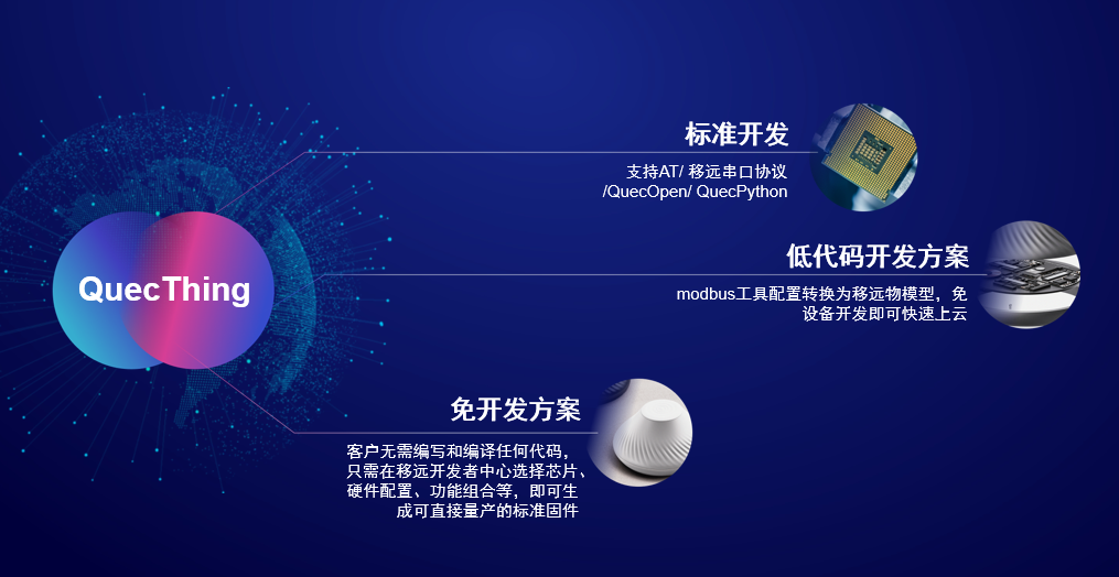與此同時,移遠還提供豐富的AT指令、移遠串口協議以及簡潔易用的接口,并開放通信模組空間,可提供QuecPython、QuecOpen、MCU SDK等多種自助接入的方式,從而幫助客戶快速開發硬件程序,加速行業的智能化進程。